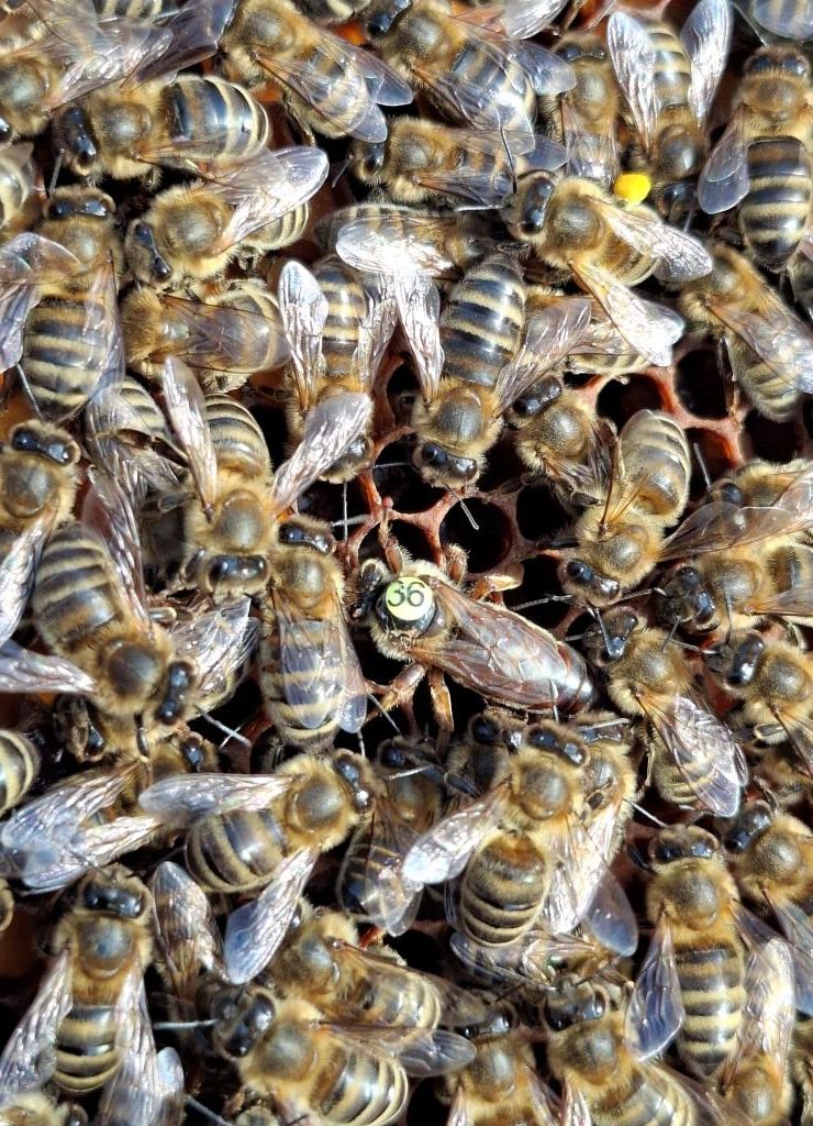 Hier werden unsere Jungimker:innen geschult und Interessierte können uns dabei über die Schultern schauen. Wir zeigen die typischen nötigen Arbeiten an den Bienen, die jeweils anstehen. Wir schauen uns die Völker an, öffnen die Beuten (Bienenbehausung) und schauen, ob die Königin da ist, ob Brut in allen Stadien da ist und ob sie in Schwarmstimmung sind.