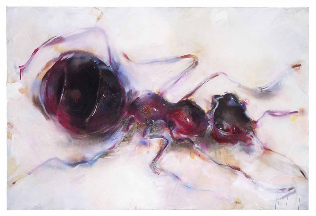 Feuerwanzen, Engerlinge, Bienen und andere Insekten sind eher ungewöhnliche Motive, denen sich Maria Trezinski in ihren Gemälden widmet. Dabei bieten die Oberfläche und Textur, das Gewicht und die Haptik den Anlass, sich mit den kleinen, teils als unangenehm empfundenen Wesen zu befassen. Sie erscheinen bildfüllend und stark vergrößert gegenüber der Realität auf Leinwände, die ein Format von 30 x 40 cm bis über 200 x 140 cm haben können. Die Darstellung verliert sich nicht in fotorealistischer Exaktheit von Details, vielmehr etabliert die Malerei eine eigenständige Formensprache, bei der die verschiedenen Insektenarten erkennbar bleiben. Die Vergrößerung und Konzentration auf ein einzelnes Insekt, manchmal auch zwei Exemplare ermöglicht eine Betrachtung, die weit über die alltägliche Flüchtigkeit hinausgeht. Dabei bringen die malerische Behandlung und die delikaten Farbverläufe sowohl die filigrane Robustheit der Insekten als auch ihre Schönheit zur Geltung, während die Umgebung nur angedeutet wird.